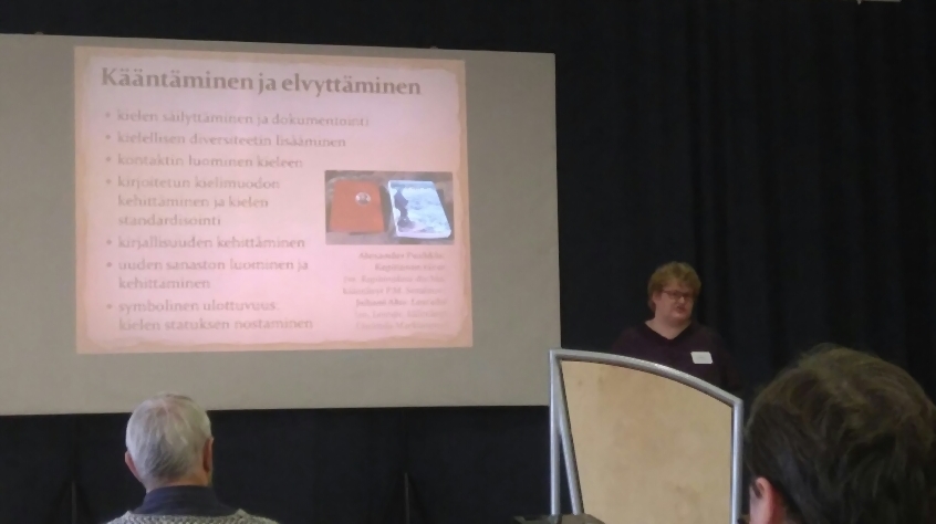 Ilja Moshnikov piti oman esitelmänsä livvinkarjalaksi. Hän käsitteli Kiännä!-hankkeen apurahatutkijana tekemäänsä tutkimusta karjalankielisistä verkkosivuista. Kokonaan karjalankielisiä verkkosivuja (joilla myös käyttöliittymä on karjalankielinen) löytyi yhteensä vain 16, ja ne muodostavat kirjavan kokonaisuuden, jossa osa sivustoista on monikielisiä. Iljan tutkimustulokset julkaistaan Virossa Lähivertailuja-sarjassa aivan lähiaikoina.